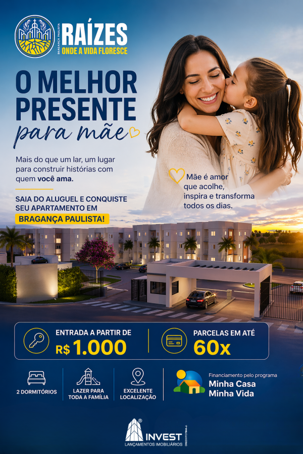 Previous Next Apartamentos de 2 dorms em Atibaia com lazer completo – Natur Residencial Natur Residencial em Atibaia!Apartamentos com 2 dormitórios de 50 m² a 68 m².Se você está em busca de um lugar especial para morar ou investir, o Natur Residencial em Atibaia é a oportunidade que você esperava! Imagine viver em uma cidade famosa pelo clima agradável, segurança e uma qualidade de vida incomparável. Aqui, no Natur Residencial, você encontra tudo isso e muito mais.Apartamentos que se adaptam ao seu estilo de vidaEscolha o apartamento que melhor se encaixa nas suas necessidades, com diversas tipologias e tamanhos que oferecem conforto e praticidade.Lazer Completo para Toda a FamíliaPlayground para as crianças se divertiremPiscina para refrescar seus diasQuadra Recreativa para praticar esportesBicicletário para os amantes de bikesChurrasqueira para reunir amigos e familiaresRooftop, você ainda encontraEspaço Fitness para cuidar da saúdeSalão de Festas e Salão de Jogos para celebrações e diversãoCoworking para quem trabalha de casaBrinquedoteca para os pequenos aproveitarem com segurançaLocalização PrivilegiadaO Natur Residencial está localizado em uma das melhores áreas de Atibaia, com acesso rápido às principais avenidas e à Rodovia Fernão Dias. Com uma infraestrutura consolidada, você terá tudo o que precisa ao seu redor: comércios, escolas, supermercados, hospitais e muito mais.Segurança em Primeiro LugarSua segurança e a de sua família são nossas prioridades. O Natur Residencial oferece:Acesso de pedestres com clausura de segurançaFechaduras eletrônicas entregues nas unidadesGuarita Blindada para maior proteçãoConforto e ConveniênciaPensamos em cada detalhe para tornar sua vida mais prática e confortável:Espaço para minimercado dentro do residencialTomadas USB entregues nos dormitórios para sua conveniênciaGaranta Seu Lugar no Natur Residencial!Não perca a oportunidade de morar ou investir em um dos melhores empreendimentos de Atibaia. Com todas essas vantagens, o Natur Residencial é o lugar onde seu novo capítulo de vida começa.Entre em contato com a nossa Central de Vendas e faça uma simulação agora mesmo.Previsão de entrega do empreendimento: OUT/26imagens meramente ilustrativas e será entregue conforme memorial descritivovalores, formas de pagamento e unidades disponíveis vide tabela de valores atualizada. R$ 418.995,00 Venda Parque das Nações Cód. 748 Aceitafinanciamento